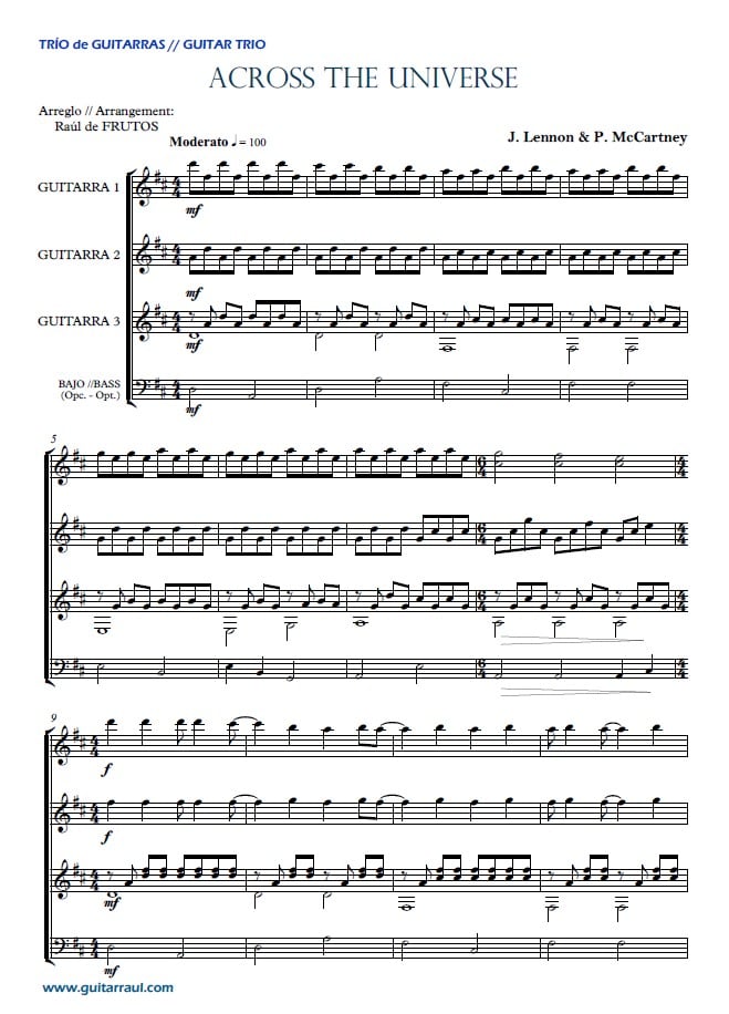 Guitar trio sheetmusic. “Across the Universe” is a deeply poetic and meditative song written primarily by John Lennon. It was first recorded in 1968 and later released on multiple albums, including “Let It Be” (1970).